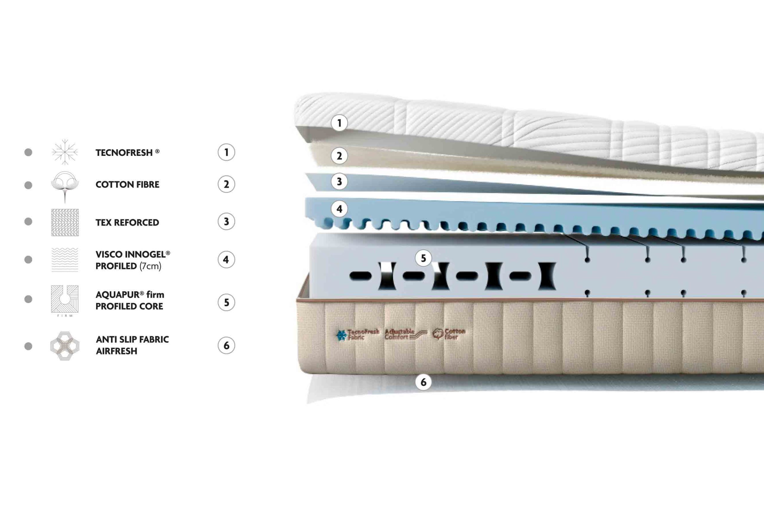 Hybrid Memory offers an enveloping and progressive sleep experience, no noise, no bouncing, just adaptation. Profiled HR Aquapur® technical foam core provides an articulated, lightweight and ergonomic base. 7 cm viscoelastic Innogel® profiled viscoelastic sheet enhances adaptability, providing a soft and continuous support. Stretch fabric with cold thread treatment. An articulating mattress, springless and with a silent responsiveness, designed for those who understand the