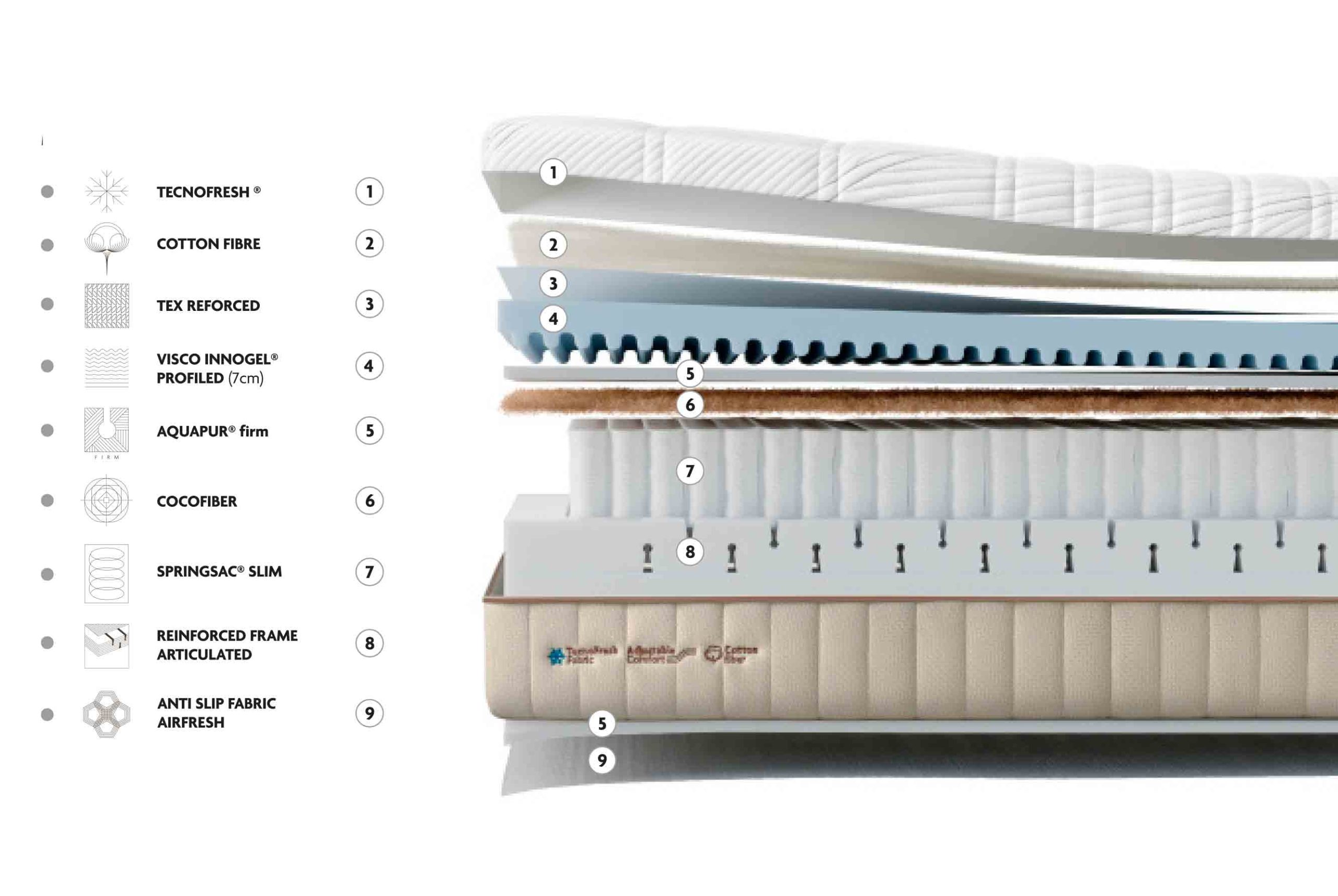 Designed for those seeking firm support without sacrificing adaptability. The natural coconut fiber provides structure, firmness and breathability, while the 5 cm of profiled Innogel® viscoelastic balances the lying position with progressive support. Pocket spring core and profiled HR frame. The cold-woven fabric completes the experience, providing constant coolness and thermal comfort. Washable, firm and perfectly balanced, for those who prefer a feeling of greater solidity without sacrificing comfort. In addition, the mattresses of this collection integrate the Duo System by means of which two different mattresses of the same series can be joined together, even if they are of different comfort. Choose your ideal rest.