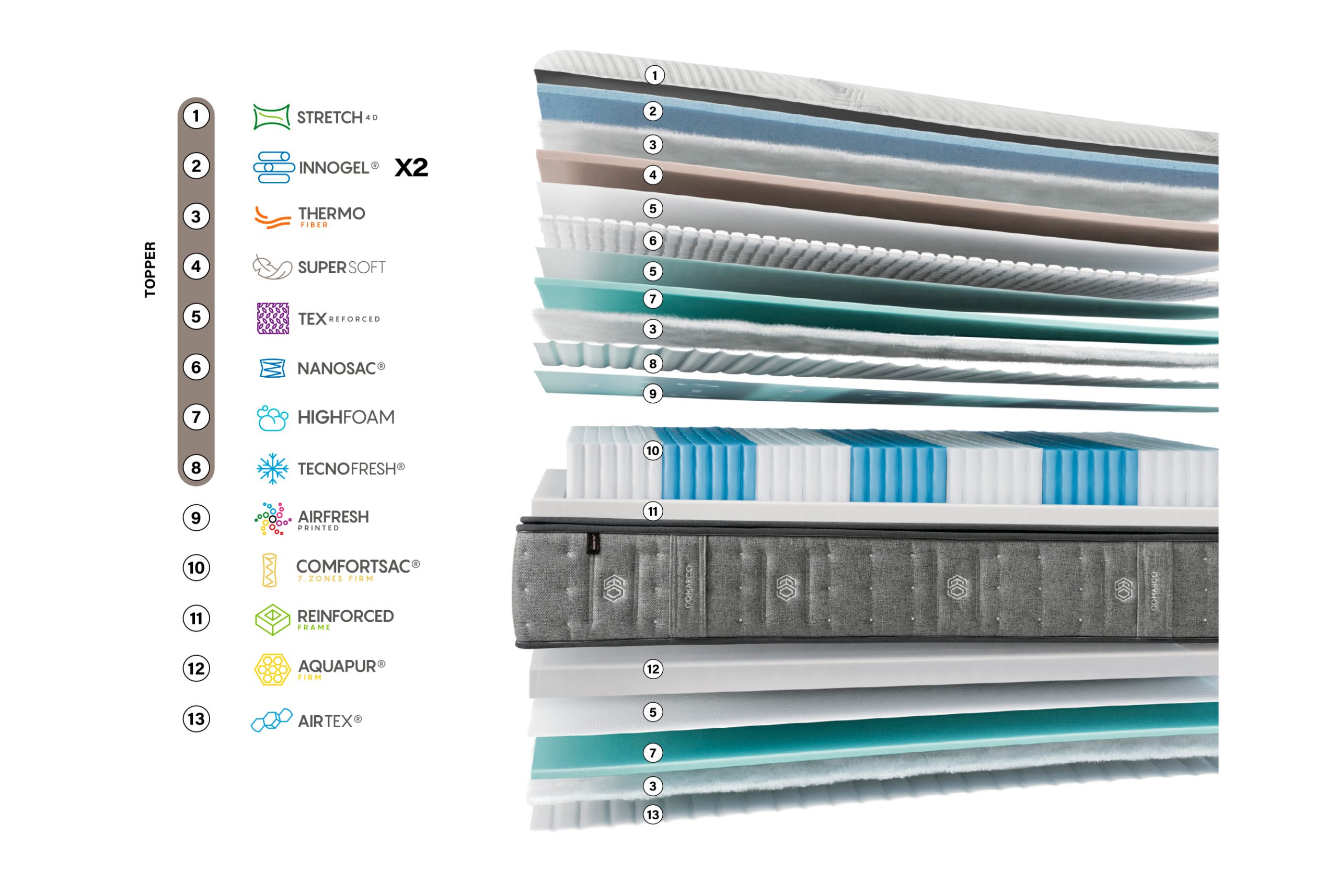 Spring Top 7Z integrates the Revertop® system, which allows you to change sensations and ventilate the mattress by turning the topper. In summer, the Tecnofresh® fabric provides coolness, while the Stretch 4D side offers softness and warmth in winter. Unlike the Dual model, its ComfortSac® 7Z Firm core with seven differentiated zones provides specific support for each part of the body, ensuring correct alignment of the spine and a stable, firm and progressive rest.