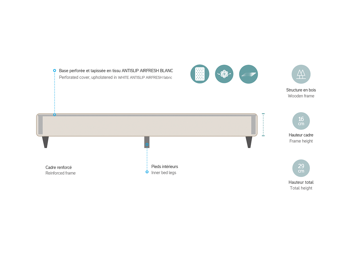 Le sommier capitonné F16 Capitoné est la combinaison parfaite de l’élégance et de la fonctionnalité pour votre chambre à coucher. Sa base perforée et rembourrée permet une meilleure ventilation, tandis que l’intérieur de la base, revêtu d’Antislip Airfresh blanc, empêche le matelas de glisser.